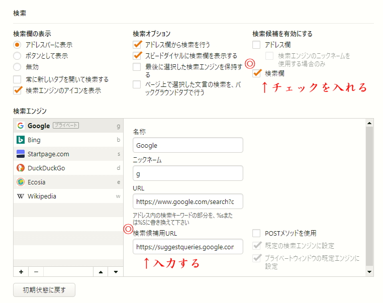 VivaldiはGoogleのサジェストを表示させる為のURLが設定されていないので、それを入力します。