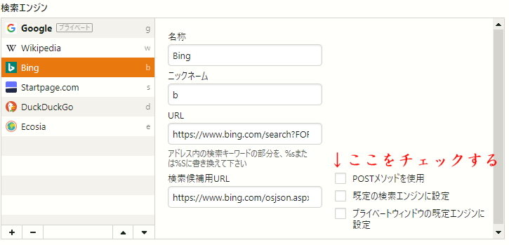 先ほど検索候補用URLを設定したフォームの右隣に既定の検索エンジンの設定を設定するためのチェック欄があるので、ここをチェックします。