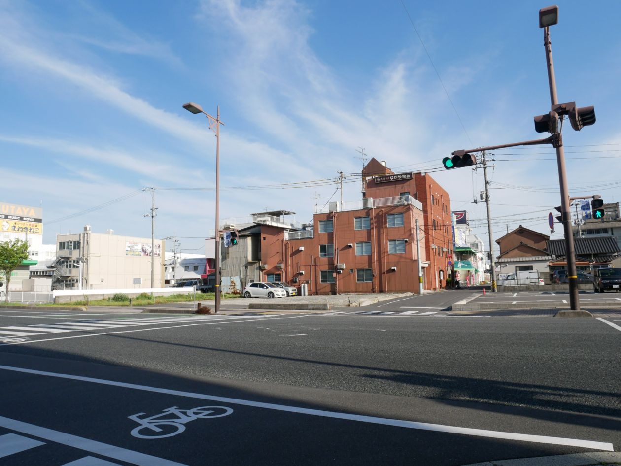 画面中央に見える茶色いビルはお菓子のなかや宗義の本社です。