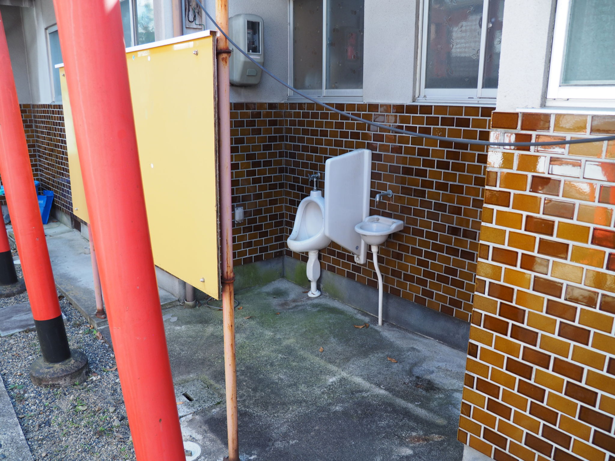 参道から丸見えの男子便所なのですが、目隠しの白い板の右下に薄っすらと青いマークが有るのが判るでしょうか?