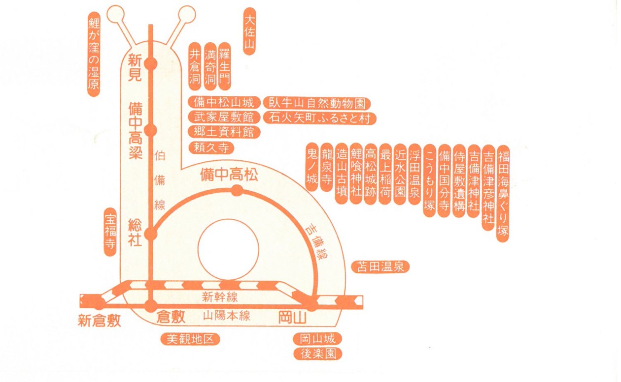 山陽本線、吉備線、伯備線を合わせて、かたつむり沿線岡山と名付けたものです。