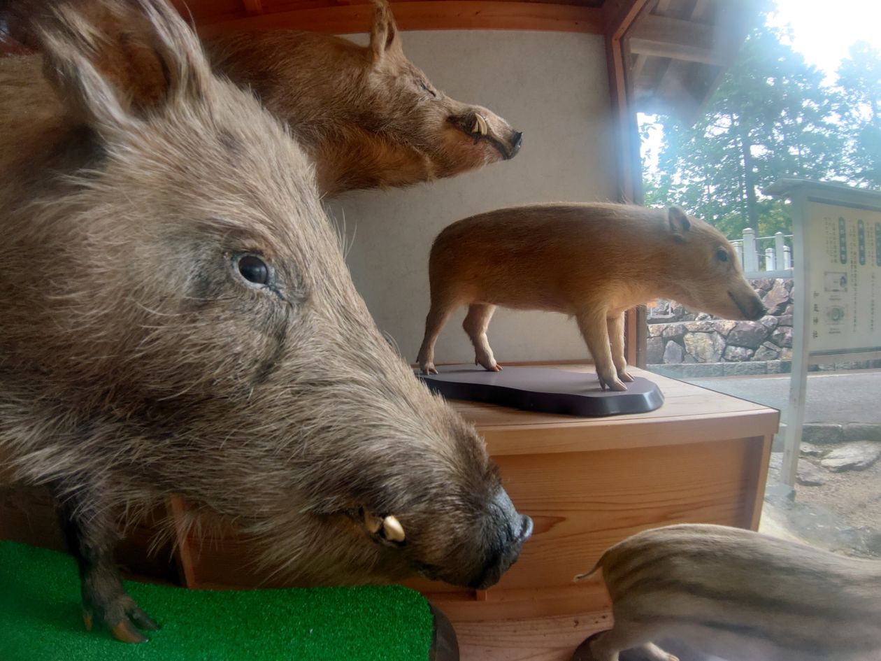 参道の途中には生イノシシがあります。
