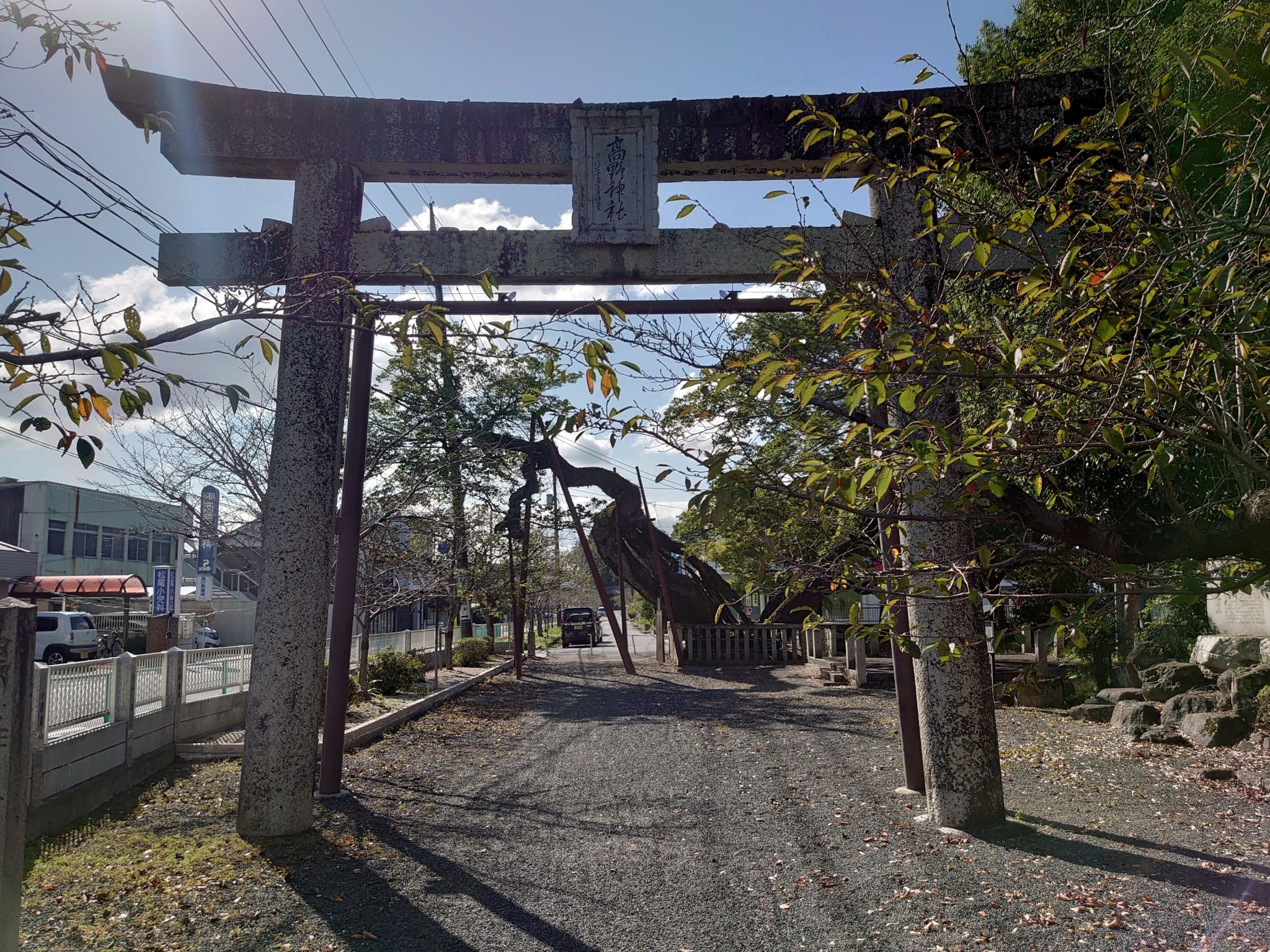 参道入り口の鳥居の奥に見える太い幹のムクノキが宇那提森です。