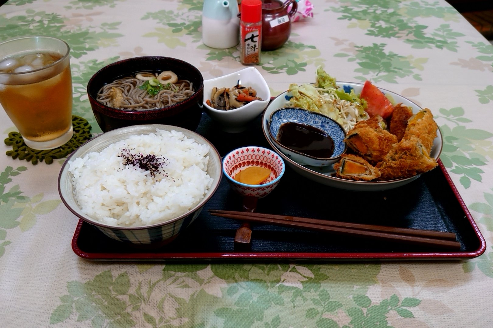 茶碗いっぱいのご飯、お吸い物じゃなくて和そば、煮物、南京と豚肉のフライ、サラダ。