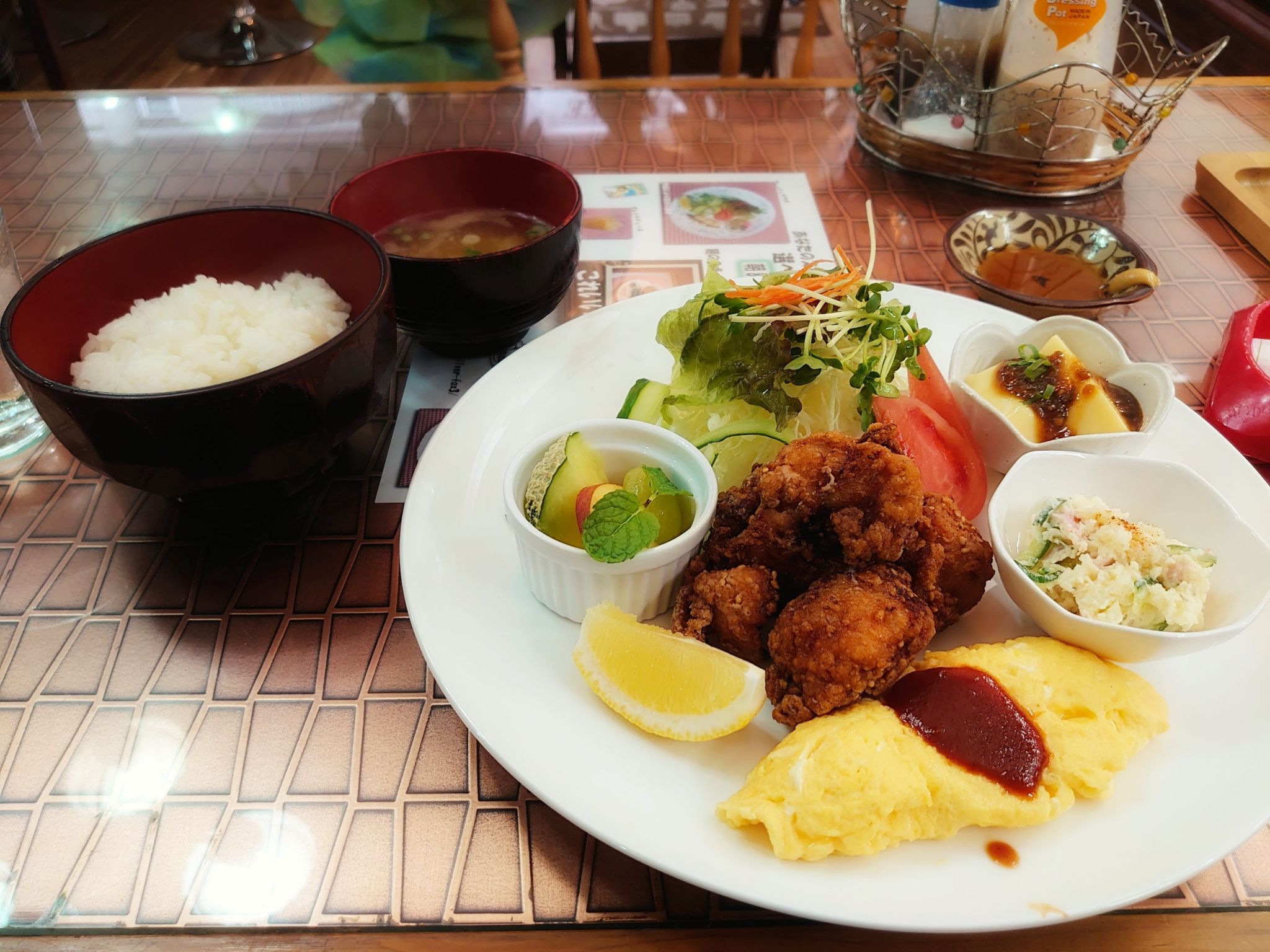 ご飯、お味噌汁、唐揚、プレーンオムレツ、サラダ、フルーツのセットです。