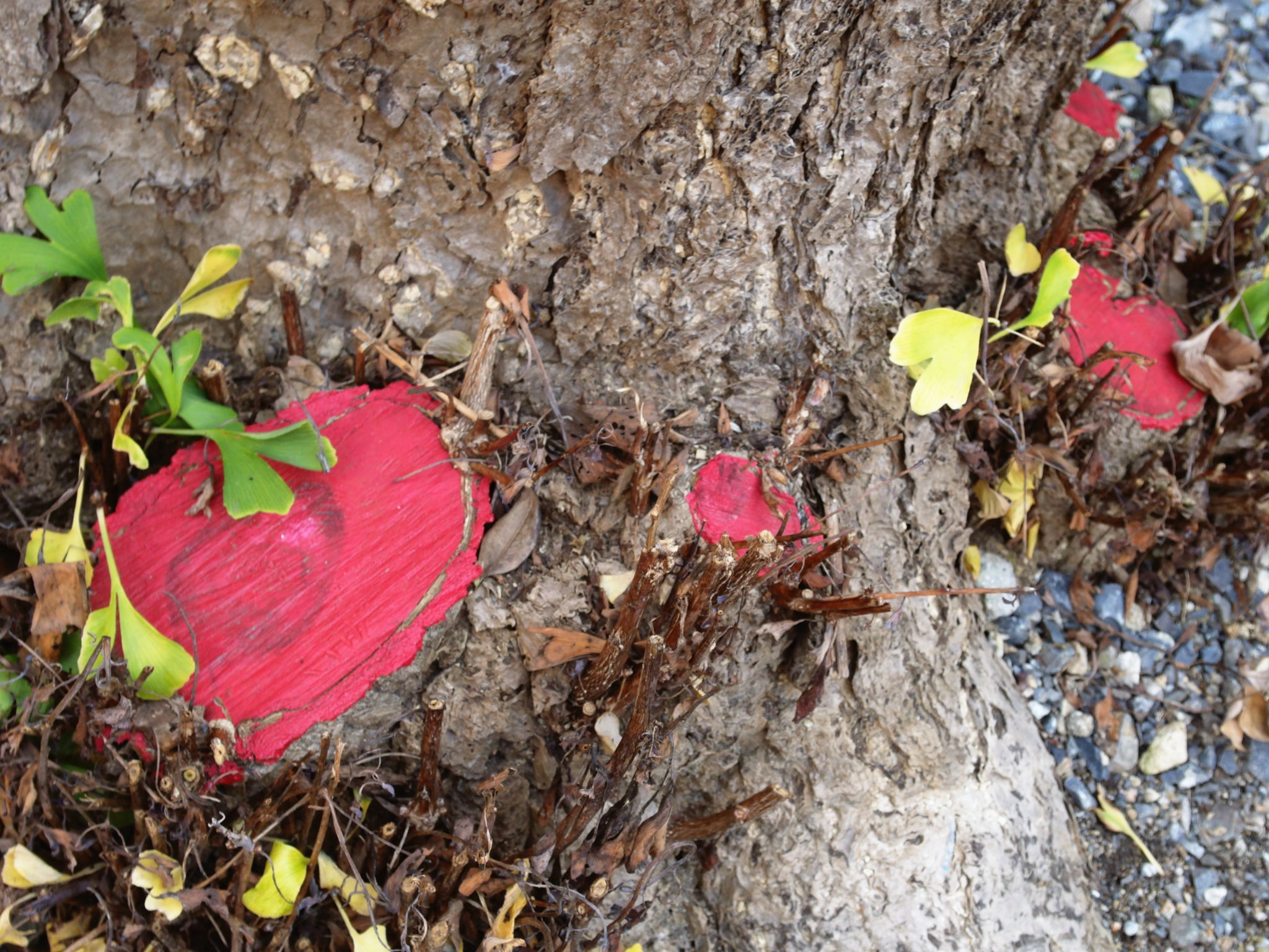 新芽が出ていた辺りを切り落としてあり、そこに赤い塗料を塗りこんでいます。