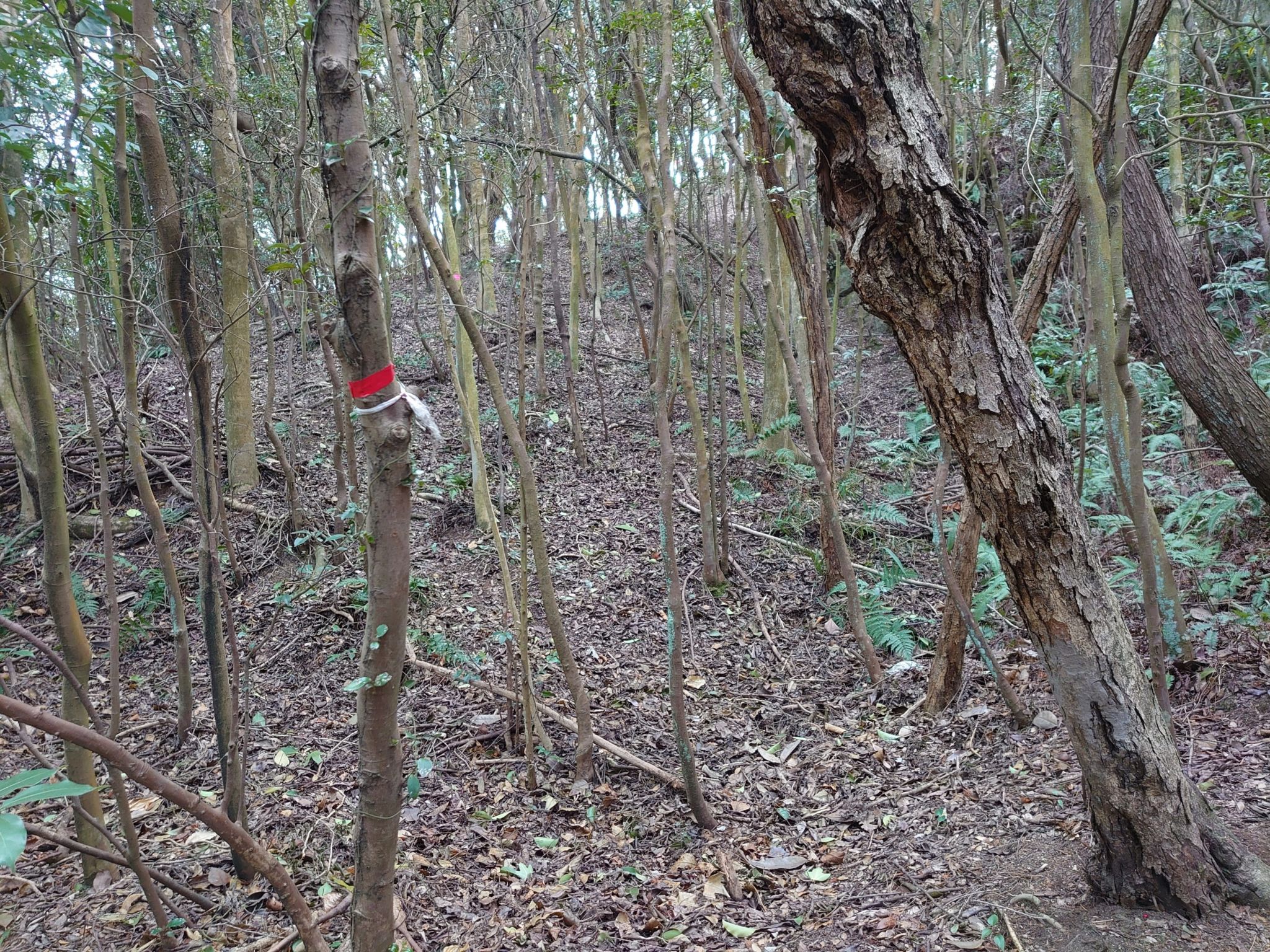 赤いテープに従って斜面を登ってみたものの、ここで完全に見失いました。