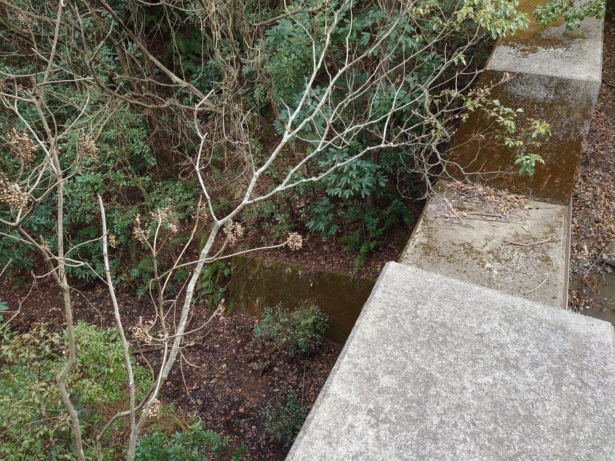 目立って面白い物はありませんが、茂みの奥をよく見ると崩壊した建物の痕跡などが見られます。