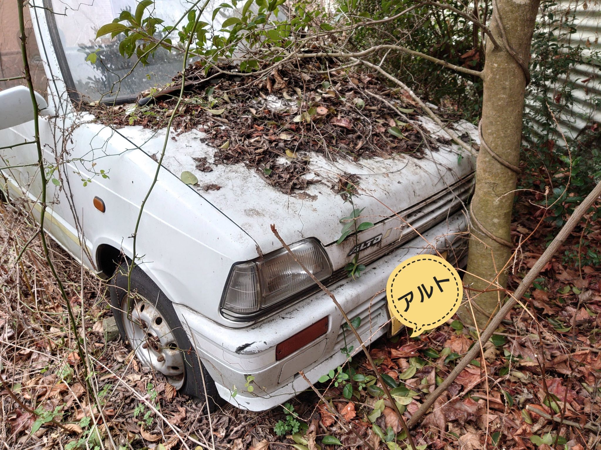 車は木の手前に駐車してあるのではなく、後から木が生えてきたのです。