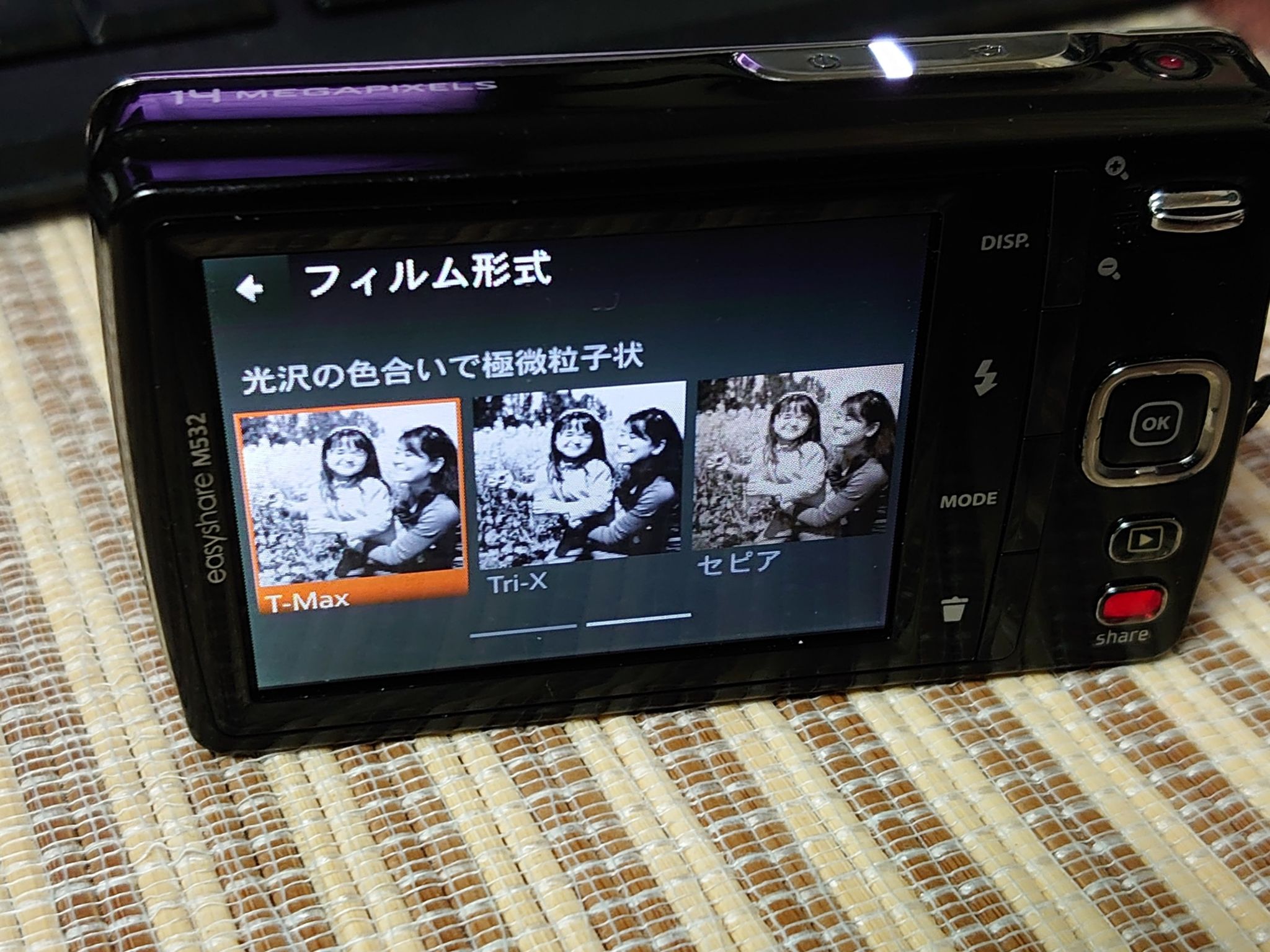 M532には普通のシーンモードに白黒撮影がないので、カメラ内では標準の白黒撮影モードという位置づけになりそうです。