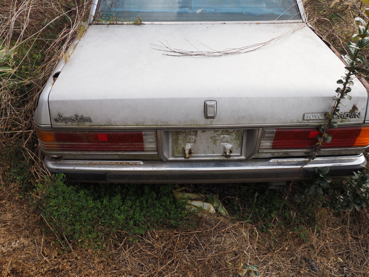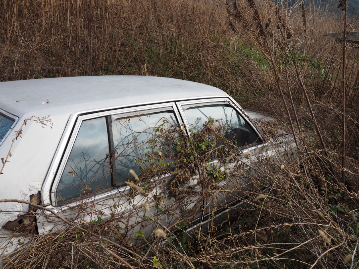 岡山市南区小串の辺りを散策していると、畑の奥の方に車が埋もれていました。