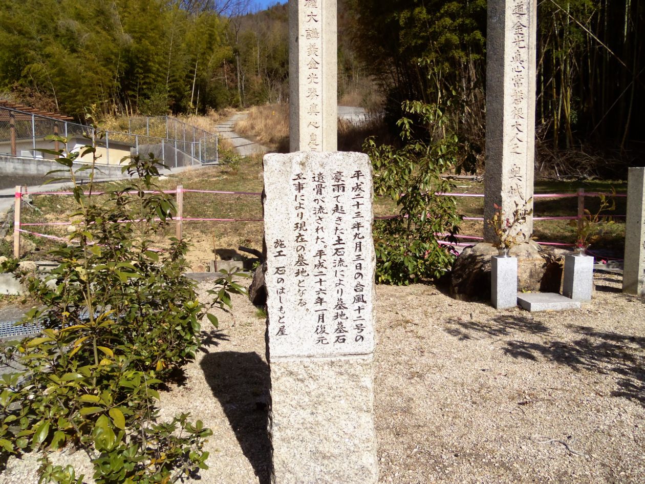 「平成23年9月3日の台風十二号の豪雨で起きた土石流により墓地墓石遺骨が流された。平成26年1月復元工事により現在の墓地となる」