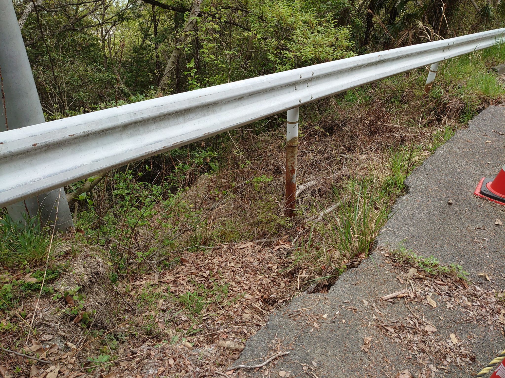 アスファルトの部分が崩壊して支柱がむき出しになったガードレールです。