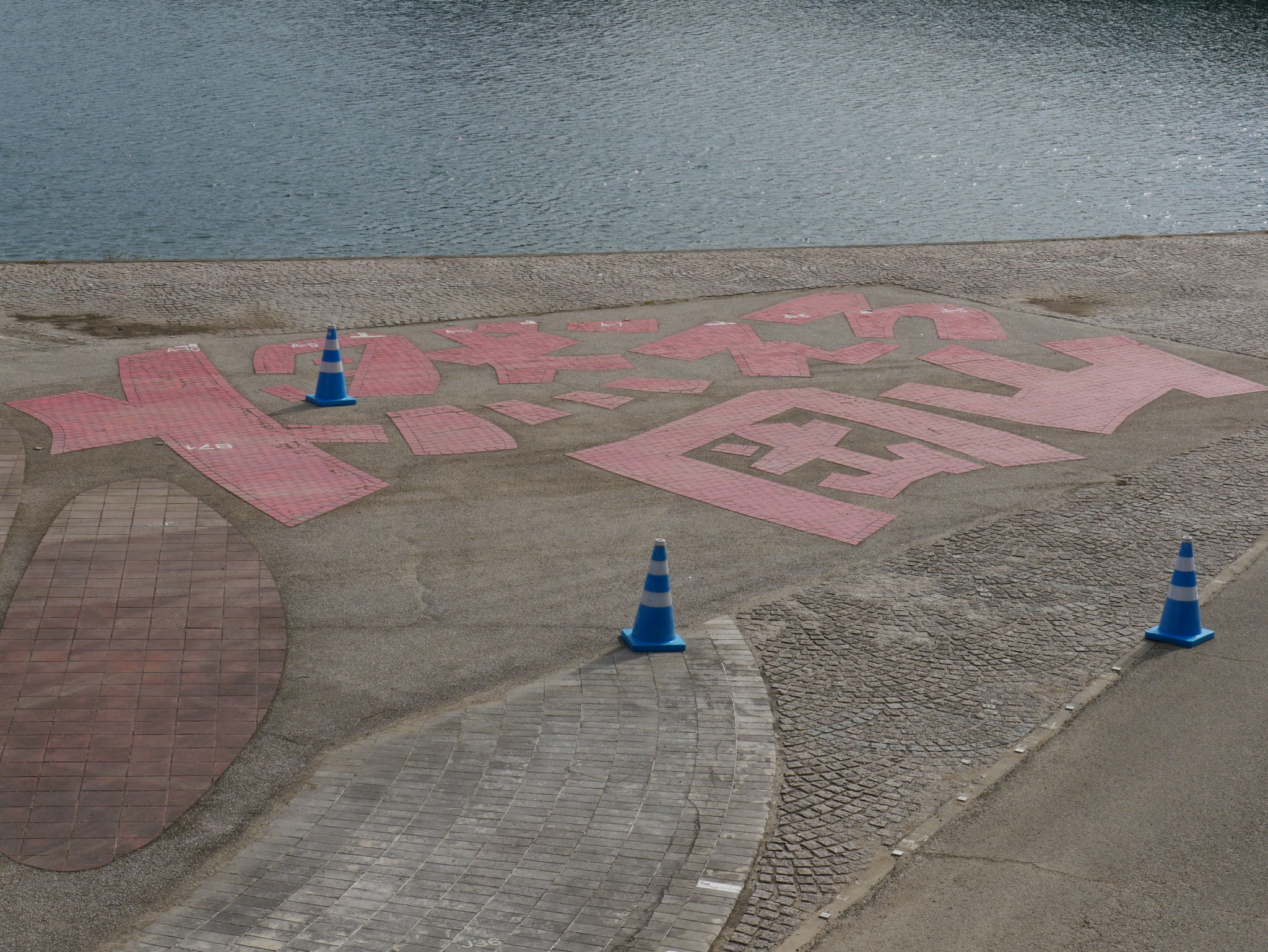 近くに一般の人が入れるような高い建物が無いので気付きづらいのですが、実は旭川に大きく書かれているのです。