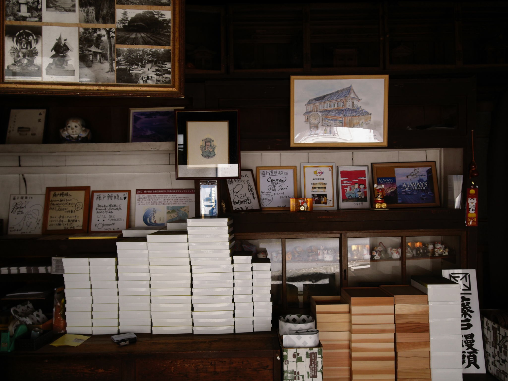 昔の藤戸の写真や、ローカルテレビのアナウンサーのサインがあります。