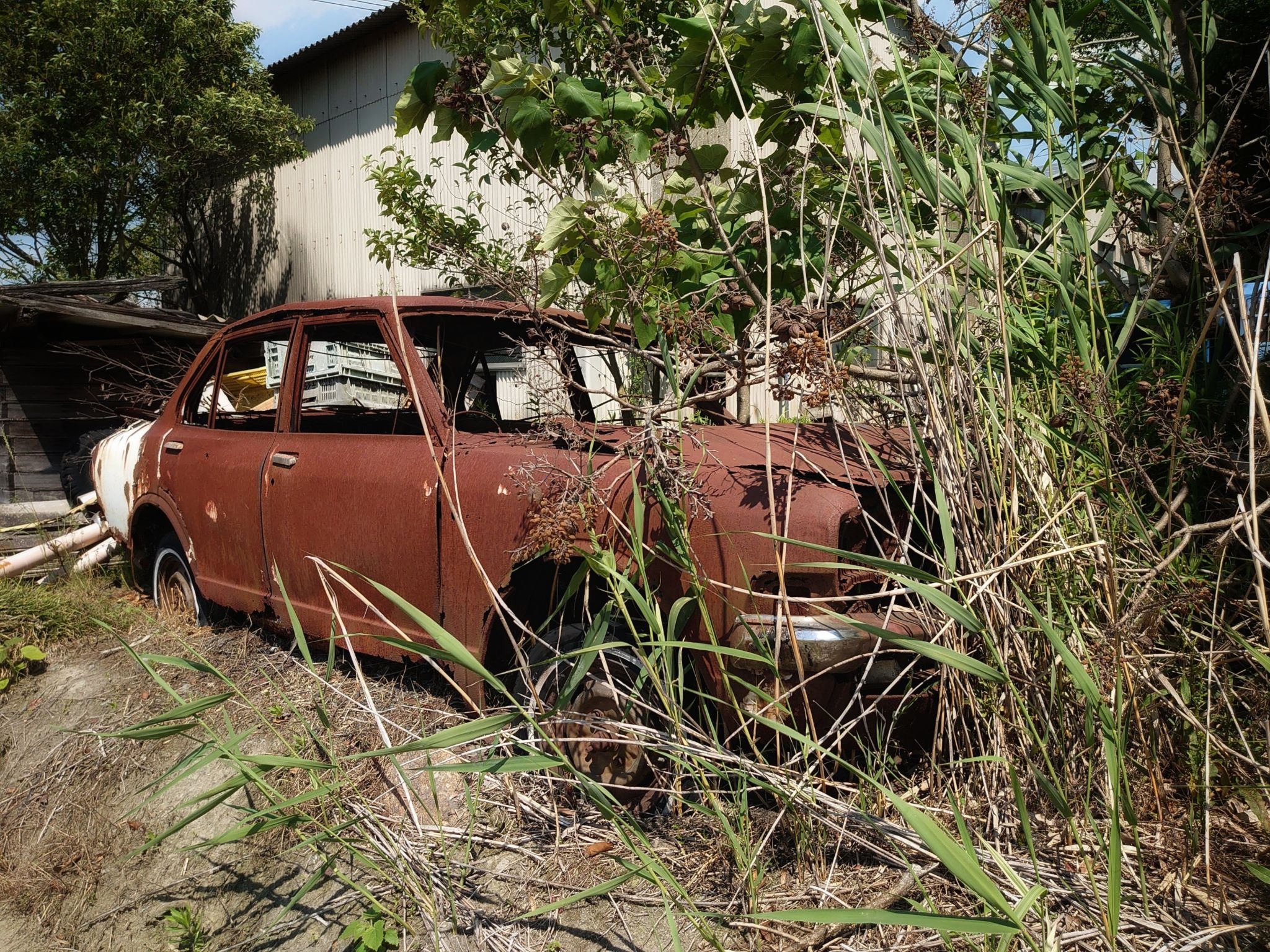 岡山市を散策していると、田んぼの奥に古い車があるのを見つけました。