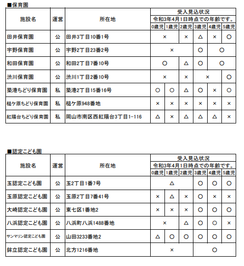 0~2歳までは受け入れに余裕が無い状況ですが、それ以外についてはわりと空いている感じです。