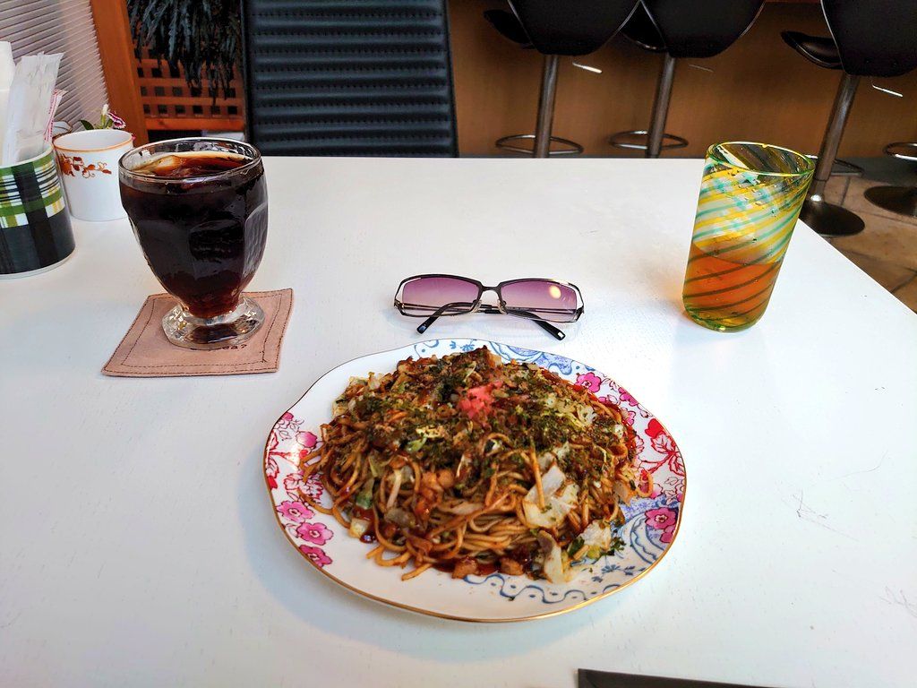 とりあえず暑くてたまらなかったので、アイスコーヒーと焼きそばを頼みました。