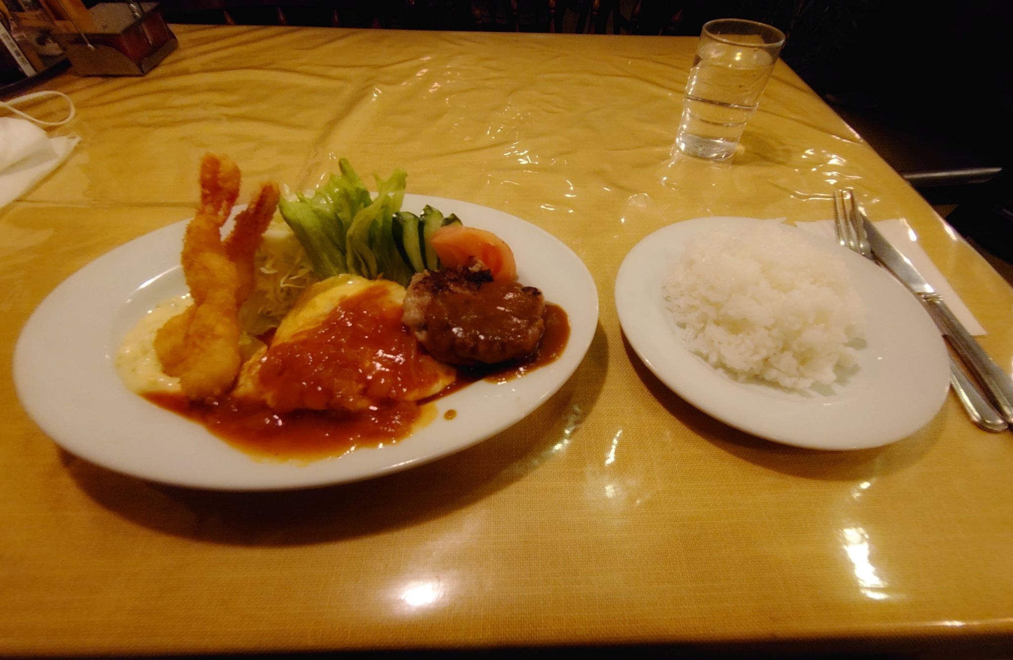Bランチはエビフライ、ハンバーグ、そしてチキンの黄金焼きです。