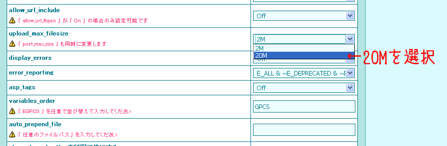 ③ 設定項目から、WORDPRESSの上限値を書いた項目を見つける