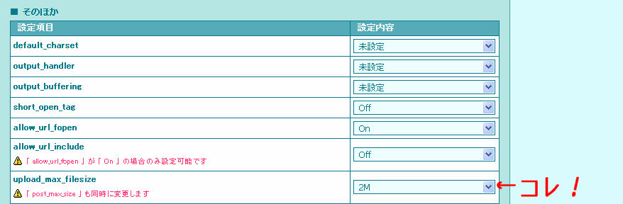 【そのほか】の項目の中盤くらいに、【upload_max_filesize】という項目があります。