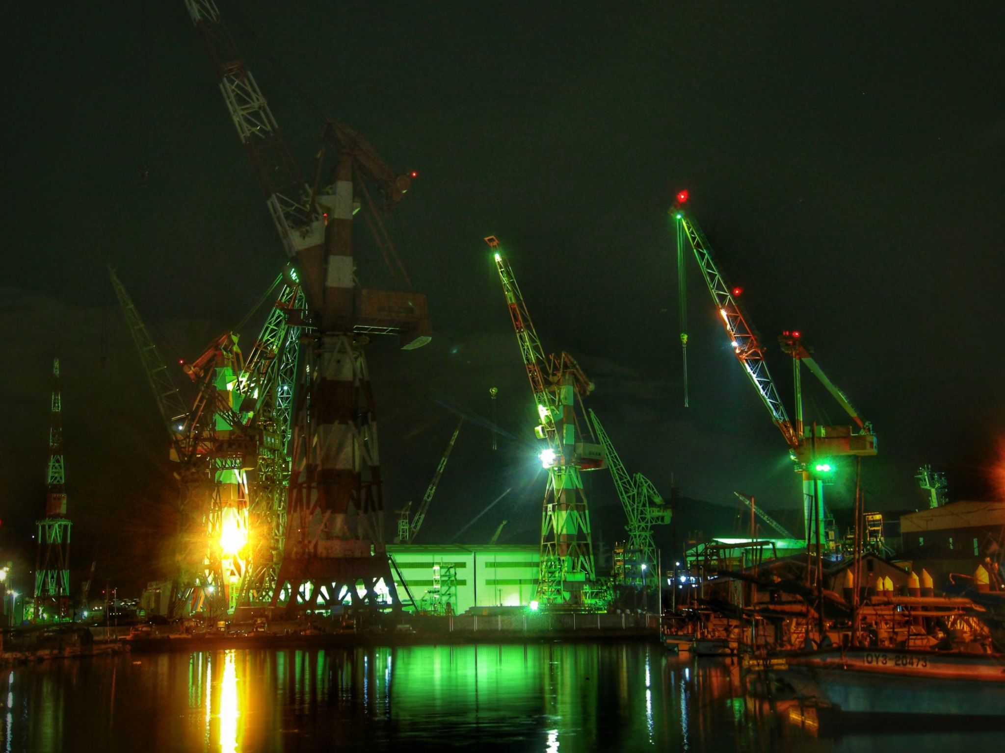 ここしばらくは夜間にクレーンが動いても1基くらいのもので、港も暗いままでした。