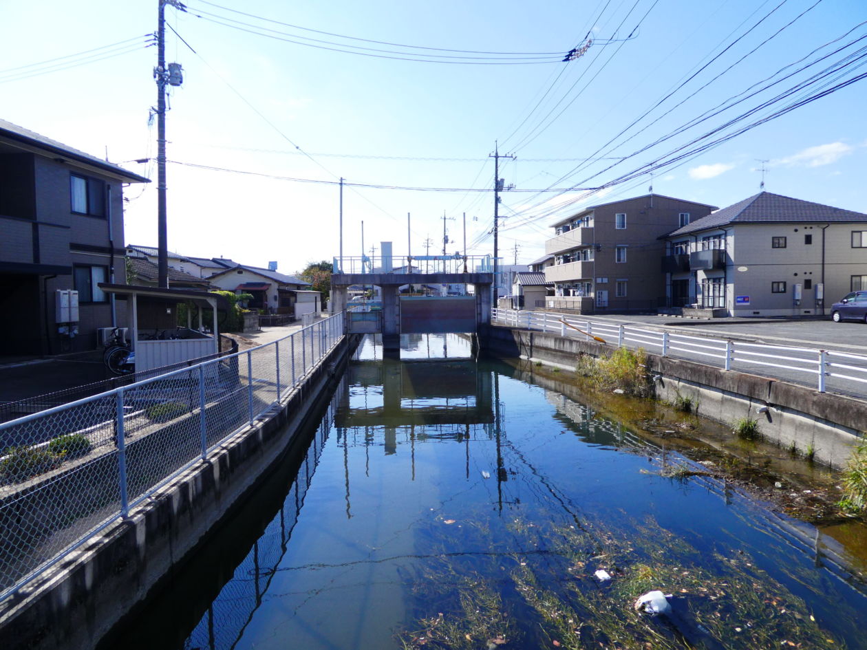 岡山市北区下中野~西市の住宅地の辺りを散策していると、立派な水門が見えてきました。