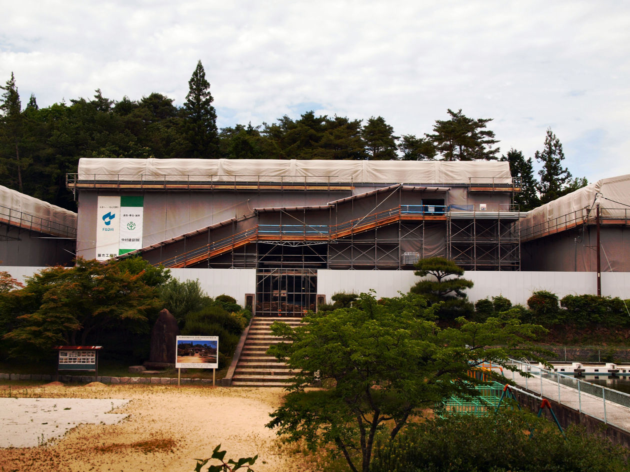 観光の目玉の旧吹屋小学校の校舎は、現在修復中でした。
