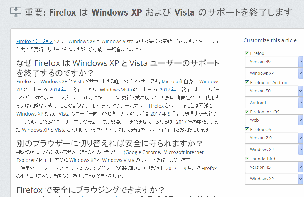 インターネットのニュースを見ていたら、FireFoxのXP、Vistaサポート終了のお知らせが出ていました。