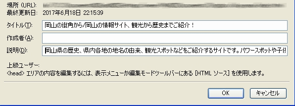 このフォームの一番上がページタイトルで、一番下が説明(Description)で、検索した際に検索結果の下に出るページの説明の文章を設定することが出来ます。