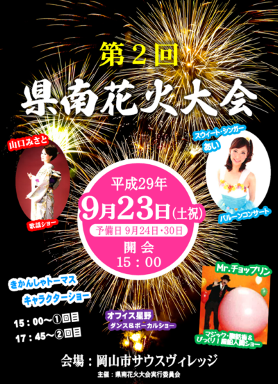 2017年9月23日:第二回岡山県南花火大会(詳細リンク→岡山市サウスビレッジ)