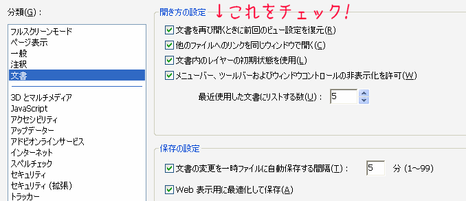そこでPDFファイルを続きから読めるリーダーが無いかと探してみたところ…、探すまでも無く純正のAdobeReader(PC版)にその機能が備わっていました。