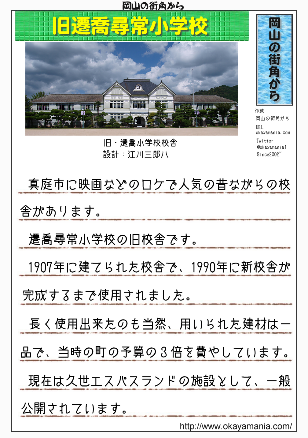 旧遷喬尋常小学校 2017年11月17日2017年10月22日 by Okayamania旧遷喬尋常小学校は初めて写真を見たときに感動した場所です。 フォト蔵で見たのかな。感動して、すぐ見に行ったけど…雲が多い日でね。上の写真みたいな感じで、どうにか青空が少しでも多く入るように撮影した事を良く覚えています。 この記事を読んだ方はこんな記事も読んでいますこちらもお勧め 【倒産】真庭市-遠藤工業(株)/破産手続き開始決定