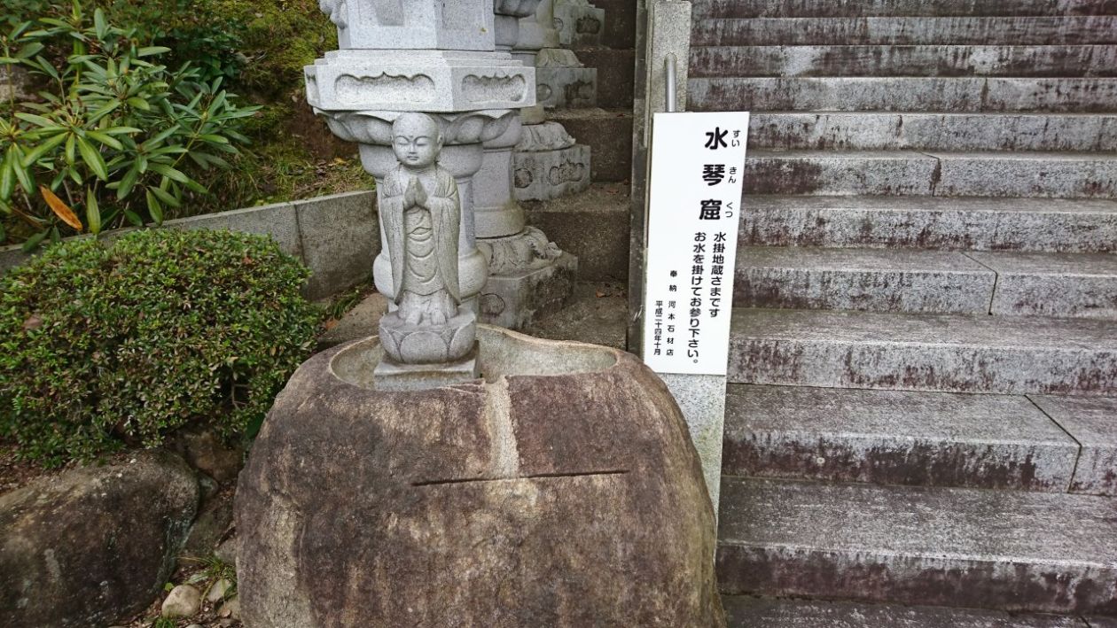 本来は下の部分が水で満たされていて、お地蔵さんにかけてあふれた水が手前の窪みから横に入っている裂け目に流れて込んで音が出るようになっています。