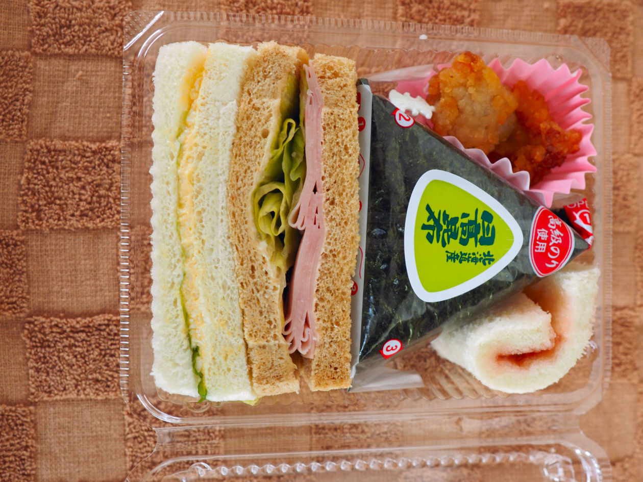 よく観察してみると、サンドイッチは卵とレタスハムの2種。おにぎりは高級のりを使用した本格派。