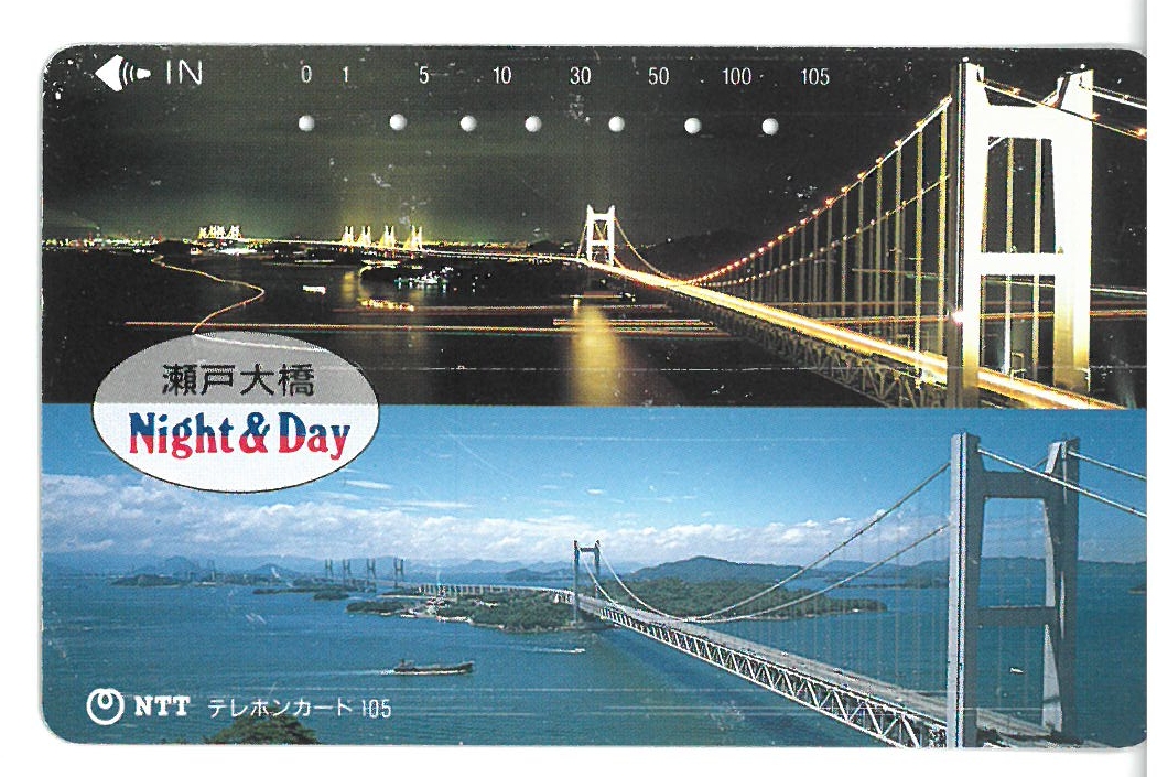 瀬戸大橋の日中と、夜間のライトアップが掲載された一枚です。
