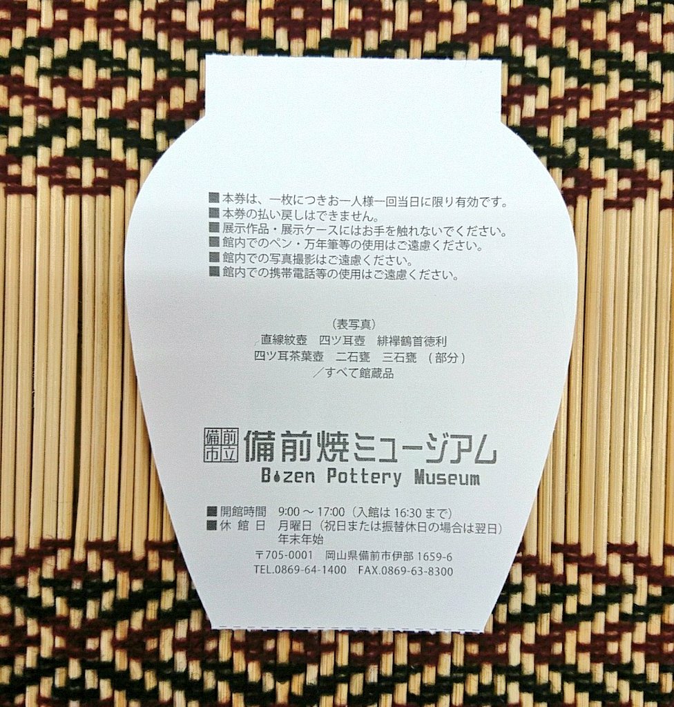 備前焼ミュージアムの入場券が超可愛い! 2018年11月5日 by Okayamania先日、備前市の備前焼ミュージアムを見学してきました。 その際に頂いたのがこのチケットです。 陶器の形をイメージした入場券です。 これは可愛いですね! いつもは入場券は雑に財布に入れてしまうのですが、大事にしまいました。裏側は館内見学についての注意点などが書いてあります。 この記事を読んだ方はこんな記事も読んでいますこちらもお勧め 【備前市】伊里駅に行ってきたよ! でも食堂が…!!