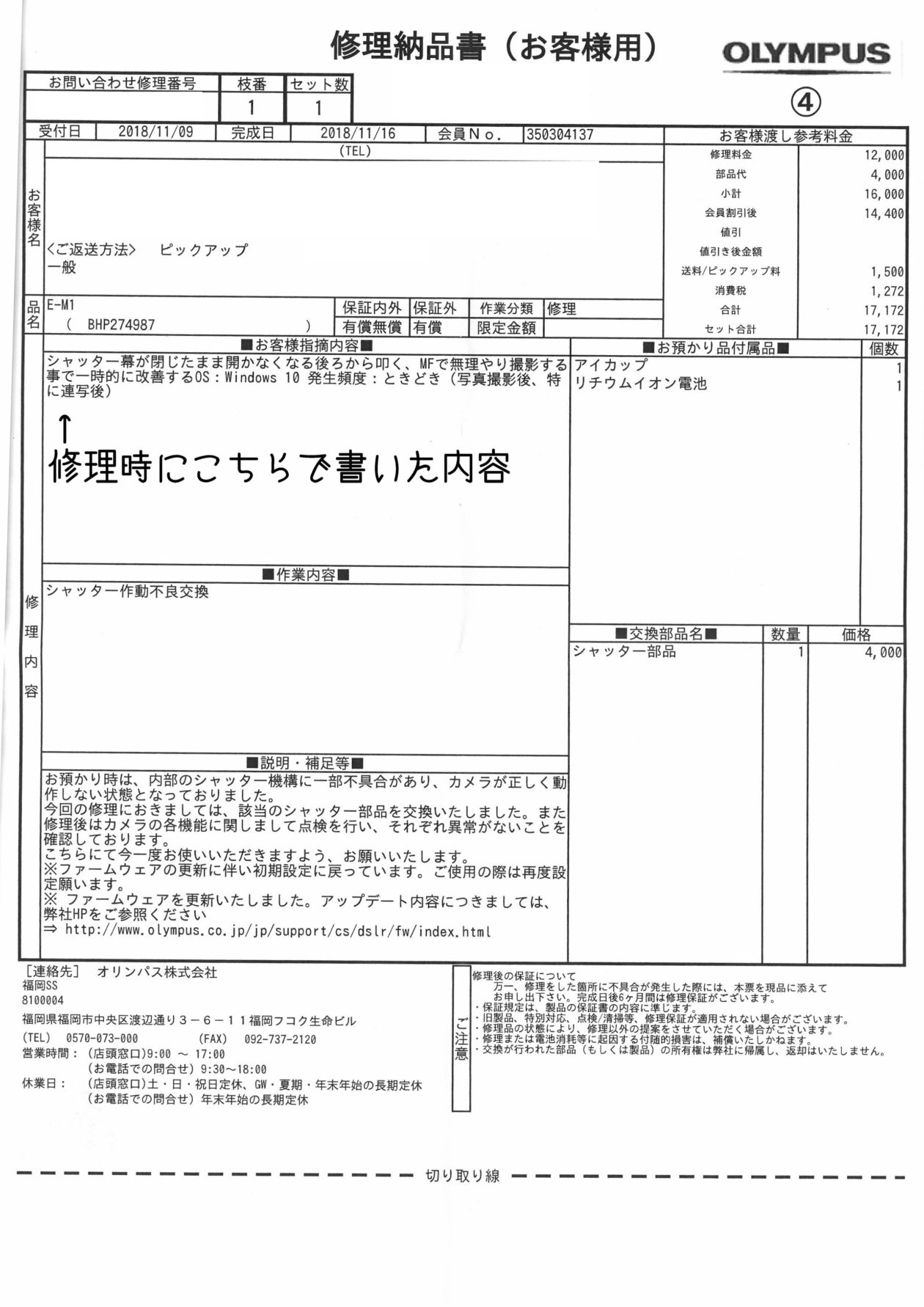 先日、Olympusに修理に出したE-M1が返送されてきました。
