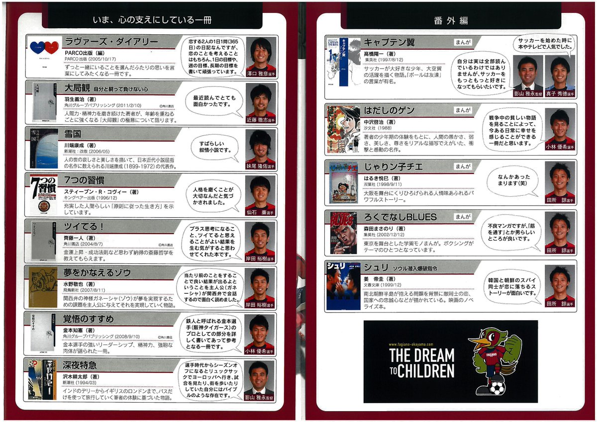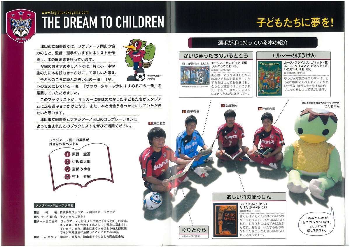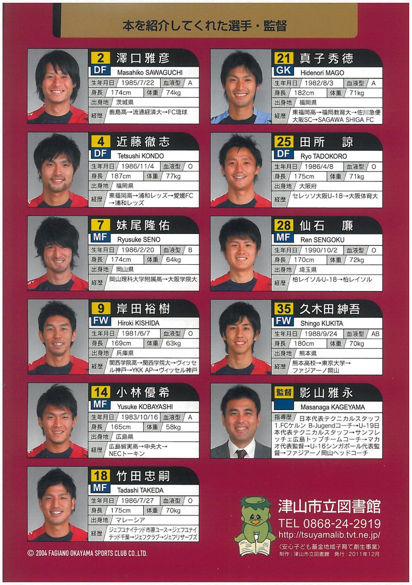 ファジアーノ岡山・津山図書館作成のおすすめ図書 2019年3月31日 by Okayamania恐らく2012年ごろのものだと思うのですが、津山図書館が当時のファジアーノ岡山所属選手にお勧めの図書を挙げてもらったパンフレットがあるのでご紹介します。左から澤口正彦さん、真子秀徳さん、妹尾隆佑さん、竹田忠嗣さん本を紹介してくれた選手一覧紹介された本とコメントコンセプトについて この記事を読んだ方はこんな記事も読んでいますこちらもお勧め 【赤磐市】備前国分寺跡に行ってきたよ!