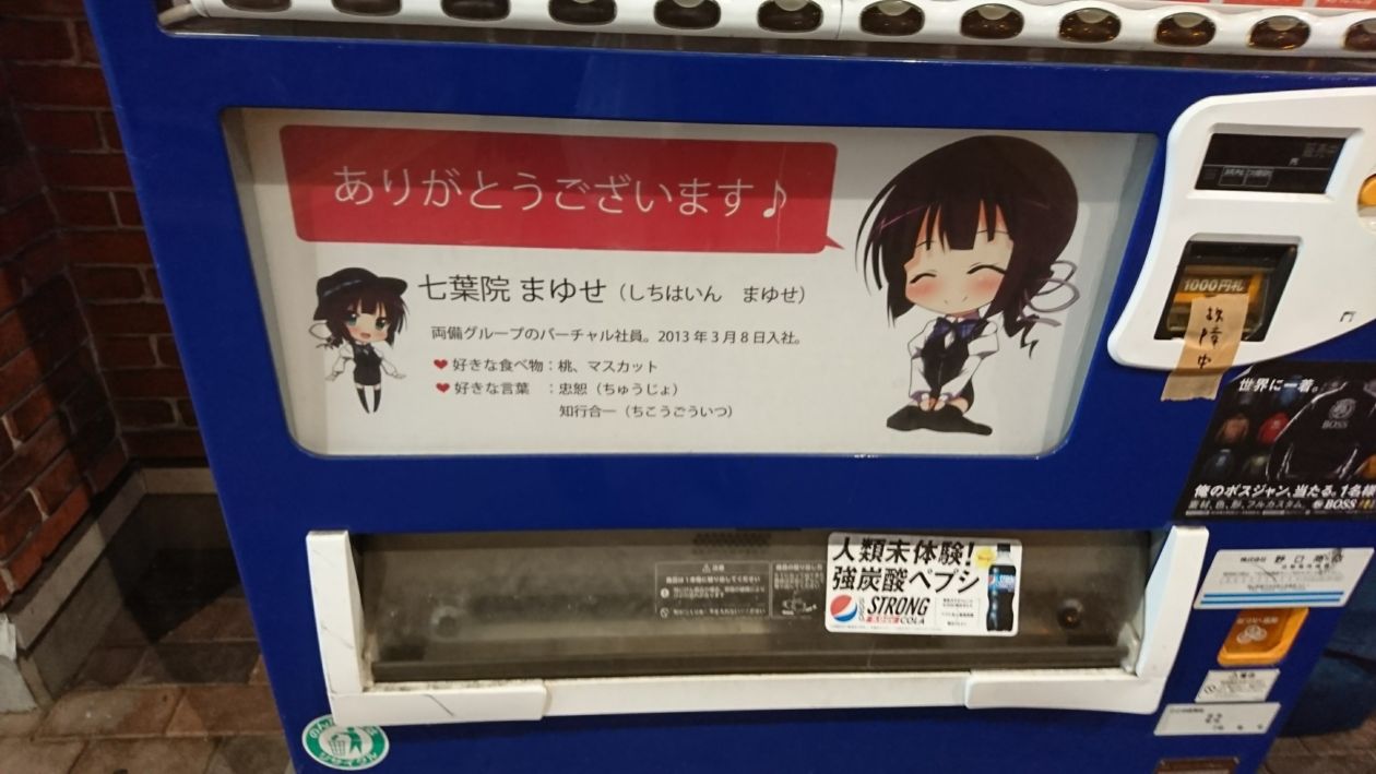 七葉院まゆせ自販機が故障中に! 2019年6月28日 by Okayamaniaリョービプラッツにある七葉院まゆせ自販機。 これは藤田のものです。 同社のバーチャル社員である七葉院まゆせが大胆に描かれた自販機ですが、なんと故障中でした。 このまま破棄とかしないでしょうね、両備さん! 段々と影が薄くなってきている七葉院まゆせですが、自販機は直しましょう! この記事を読んだ方はこんな記事も読んでいますこちらもお勧め 井村屋の什器?を見つけたよ!