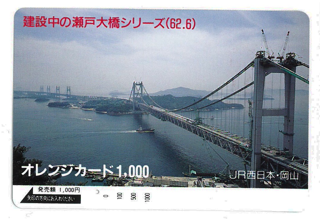 【レトロ写真】オレンジカード・建造中の瀬戸大橋シリーズがあったよ! 2019年8月3日 by Okayamania懐かしいものを入手したのでご紹介します。JR西日本のオレンジカードで、建造中の瀬戸大橋シリーズです。遠目に見ると見慣れた瀬戸大橋ですが、塔の上にクレーンがあったり、道路の部分にもアスファルトが敷かれていません。 テレビで毎週日曜日くらいだったか、工事の進捗状況を放送していました。 その頃はこの様子を見てワクワクしたものです。 この記事を読んだ方はこんな記事も読んでいますこちらもお勧め 【レトロ写真】児島湖・水質が悪かった頃の写真