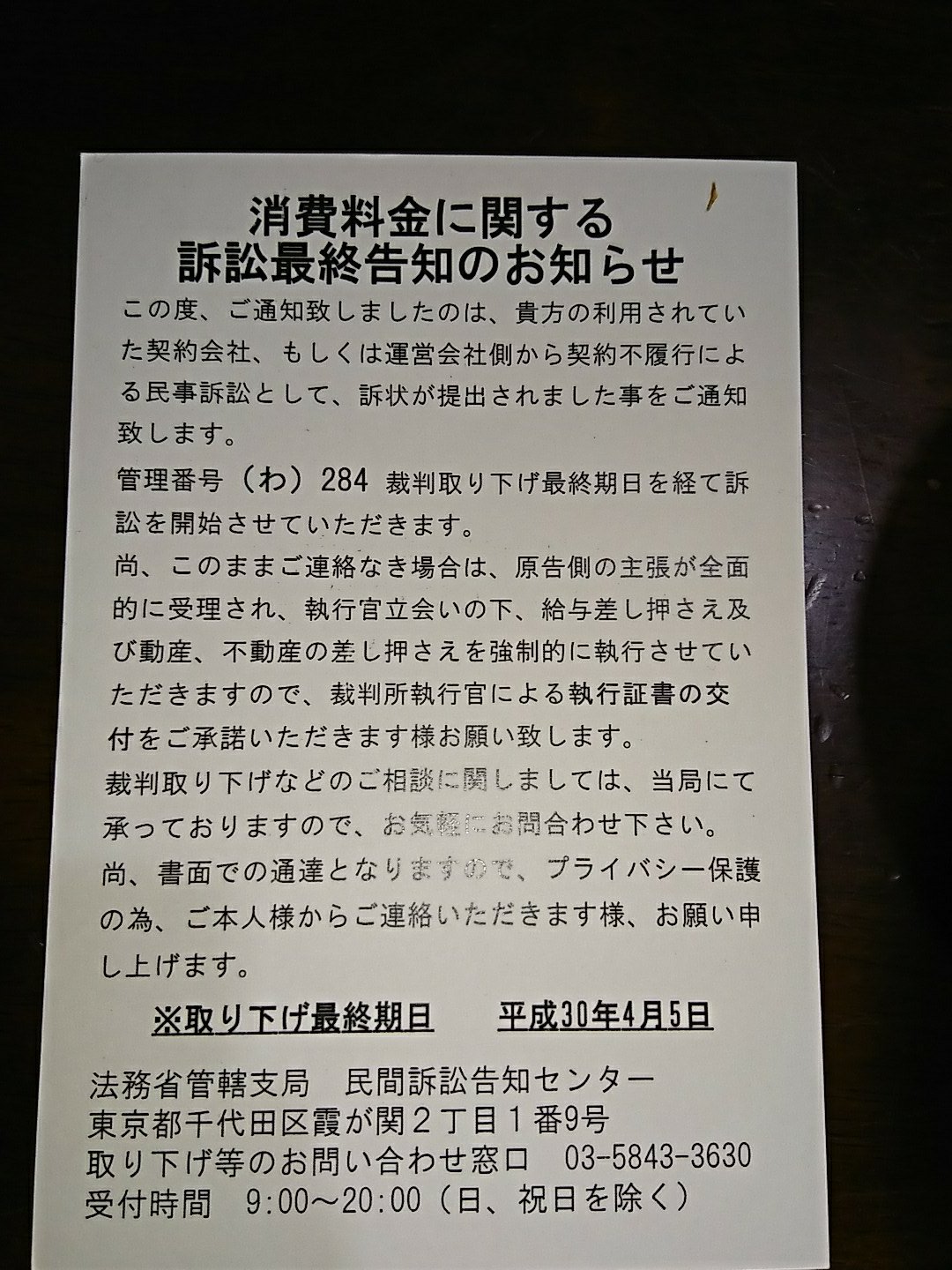 →民間訴訟告知センターから訴訟最終告知のお知らせが来たよ!←