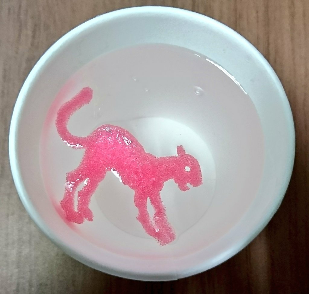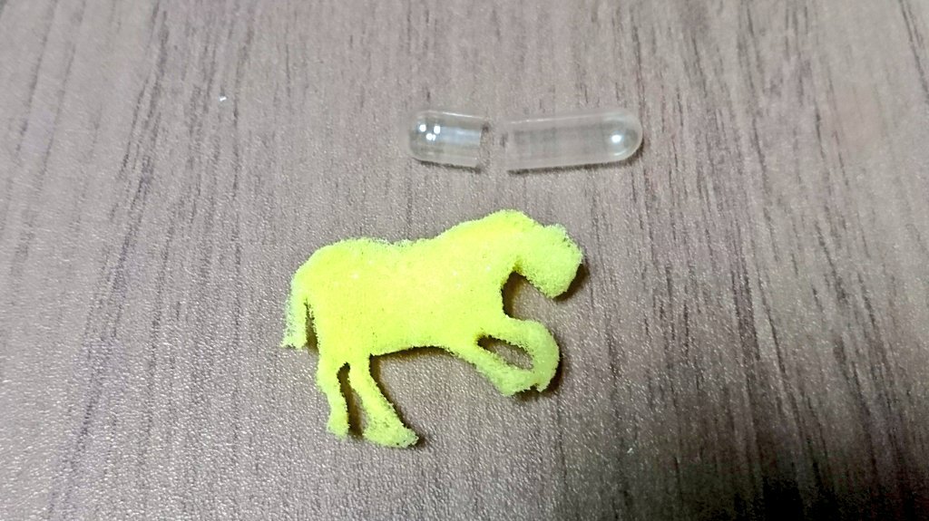 実はこれ、カプセルの中にギュウギュウに動物の形をしたスポンジを詰め込んでいます。
