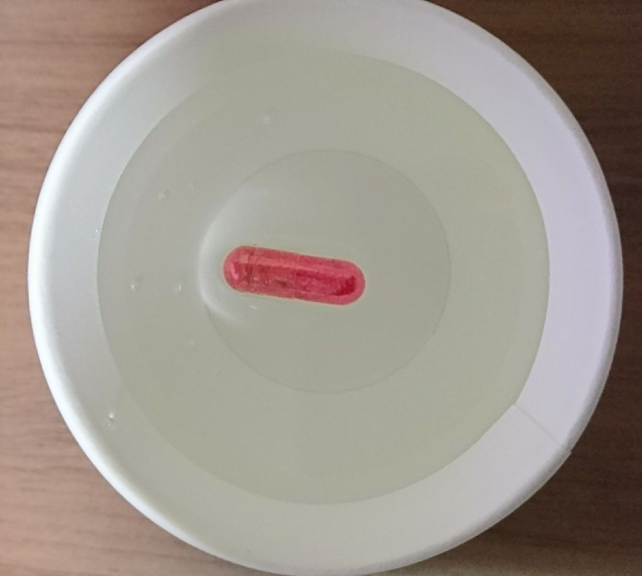 水に入れるとカプセルが溶けて、中のスポンジが出てきます。