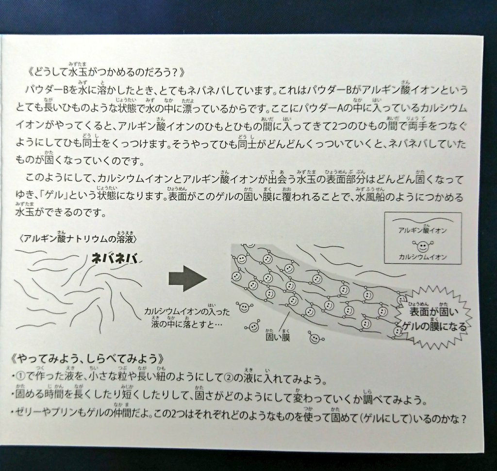 つかめる水玉で遊んでみたよ! 2020年1月20日 by Okayamania100円ショップで買物をしていたところ、つかめる水玉という商品を見つけました。商品はこの2つです。 これをそれぞれ水で溶いていきます。水を入れる容器と混ぜるための棒がそれぞれに必要になります。右側のコップで固形の水玉が出来ます。 これを左側の水に入れて固めていきます。結論から言うと、こんな感じに出来上がります。 まぁ…水玉を持っているような感じです。原理については説明書で解説されていますが…、内容がややガチです。 難しいので興味がある方は読んでみて下さいね。 この記事を読んだ方はこんな記事も読んでいますこちらもお勧め 【缶詰ポーチ】さばみそ煮缶ポーチを手に入れたよ!