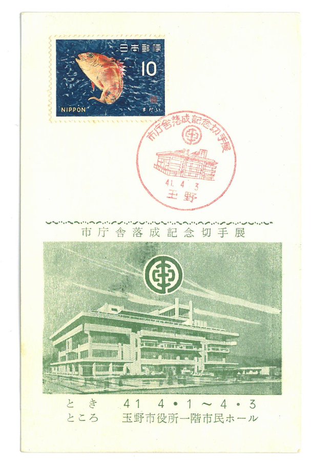 こちらは玉野市の市庁舎が落成した際に行われた記念切手展の案内状ですが、ご覧の通り庁舎は1966年築です。