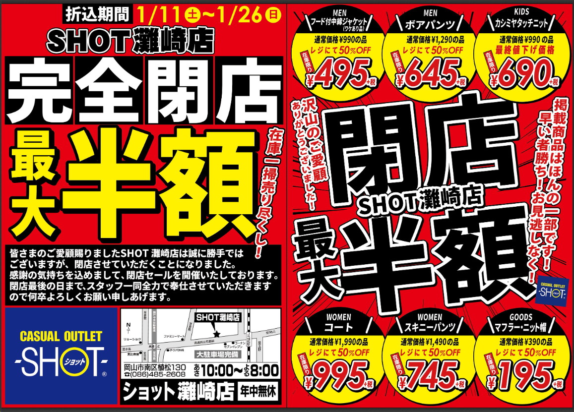 岡山市南区灘崎町のSHOTが閉店だそうです。