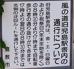 『旧児島駅舎内は、金・土・日曜日および祝祭日(年末年始を除く)の8時30分より17時まで自転車 歩行者の通り抜けが出来ます』