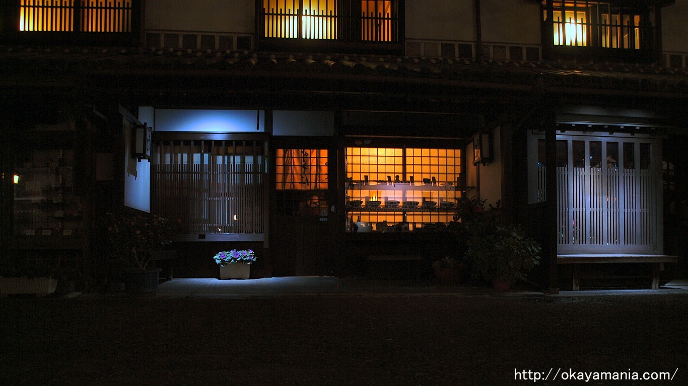 倉敷美観地区の夜は意外と早く、夜間照明の時間帯になると飲食店ぐらいしか営業していません。